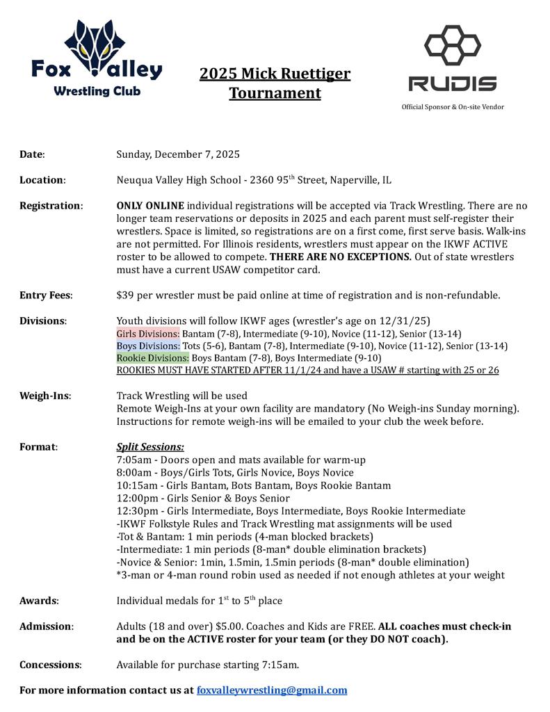 If you are a Fox Valley Wrestler do NOT use the link on Track Wrestling to register. Your registration cost was included in your annual membership.